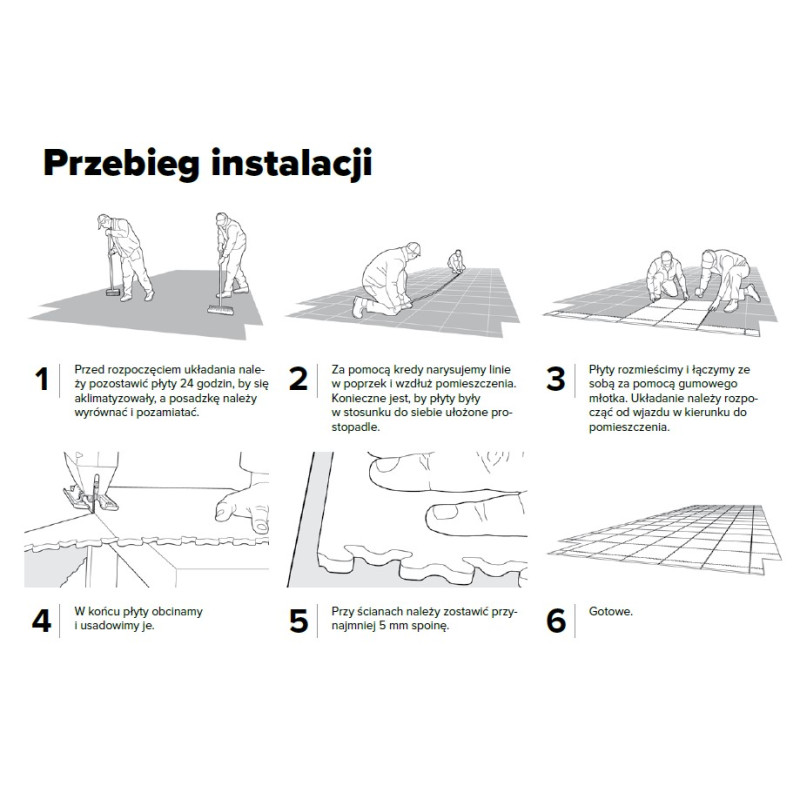 | Montaż | Bezklejowy (system zamków) | Oszczędność czasu i kosztów ekipy montażowej |