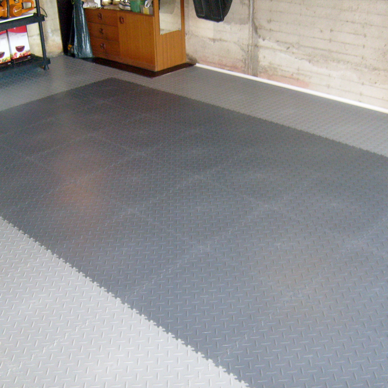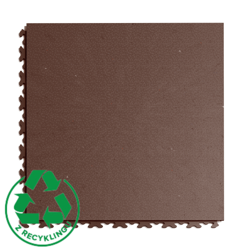 Szczera uwaga o kolorze (E-E-A-T): Wariant ECO Brown powstaje z regranulatu. Musisz wiedzieć, że nie jest to "laboratoryjny", jednolity brąz znany z farb RAL. Kolor ma głębię, ale mogą pojawiać się na nim drobne smugi czy ciemniejsze wtrącenia. W praktyce użytkowej jest to zaleta – taka niejednorodna struktura kolorystyczna doskonale maskuje zabrudzenia typowe dla piwnic czy garaży (kurz, błoto, ślady ziemi), które na jednolitej posadzce byłyby od razu widoczne.