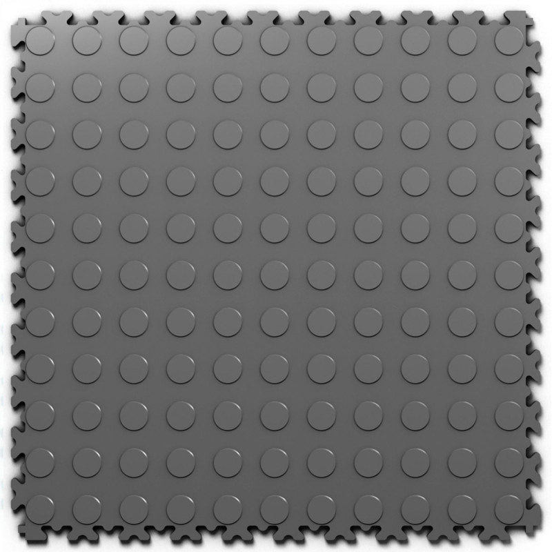 Fortelock Industry Graphite Monety to modułowa płyta posadzkowa klasy przemysłowej (Heavy Duty), wykonana w 100% z homogenicznego PCW o grubości 7 mm. Wyróżnia się kolorem grafitowym (ciemnoszary, zbliżony do RAL 7015) oraz powierzchnią o strukturze pastylkowej (wzór monet), która zapewnia optymalny balans między antypoślizgowością a łatwością utrzymania czystości.